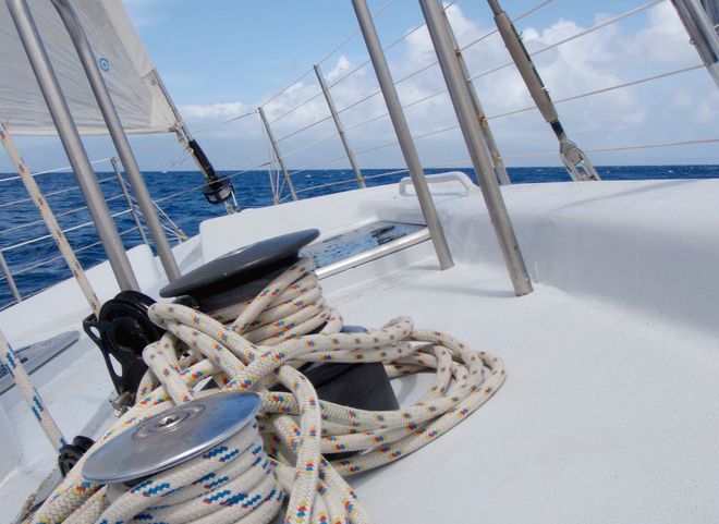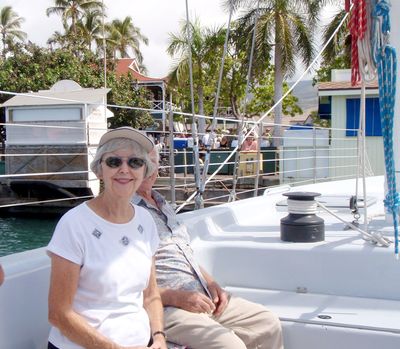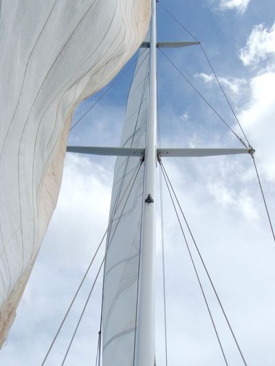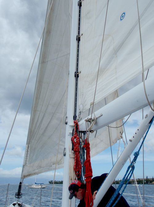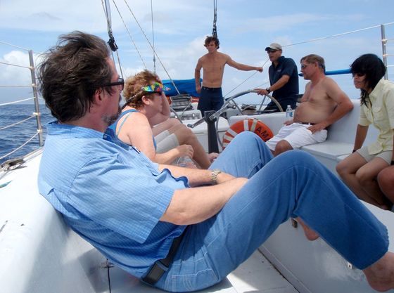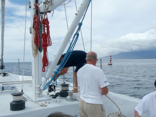 Mike and another passenger help Brett haul up the sail. (Marty said,